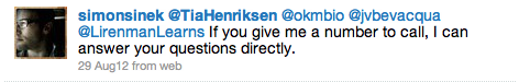 Take last summer, for instance. While reading the book Start With Why by Simon Sinek, a group of educators  decided to do a Book Chat on Twitter about the book.  We picked a date and time and tweeted out for everyone. One of us added Simon Sinek’s Twitter name to the list.  The night of the chat came along (9pm PST) and what do you know, we get a tweet from Simon Sinek himself (keep in mind that it was 12am Simon’s time):